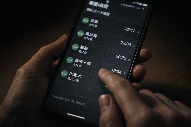 駅の券売機や専用のスマホアプリで、過去の利用履歴を確認できます。もしパートナーが「職場(例:丸の内)」で残業していたはずなのに、履歴に「六本木」や「麻布十番」といった駅での降車記録があれば、仕事という言葉が嘘であったことが証明されます。特に、帰宅時間が遅い日の降車駅が普段と違う場合は、浮気相手の居住エリアや密会場所を示唆しています。